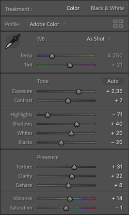 W pierwszej kolejności musimy nasze pliki RAW edytować w programie Lightroom, możemy wykonać to na dwa sposoby albo przeprowadzamy pełną edycję zdjęcia tak aby wyglądało dokładnie tak jak chcemy, albo wprowadzamy tylko podstawowe korekty a po zakończeniu całego procesu scalania zdjęć w jedną całość dokonujemy edycji docelowej. Ja wybrałem drugą opcję a zastosowane przeze mnie korekty wyglądają następująco: