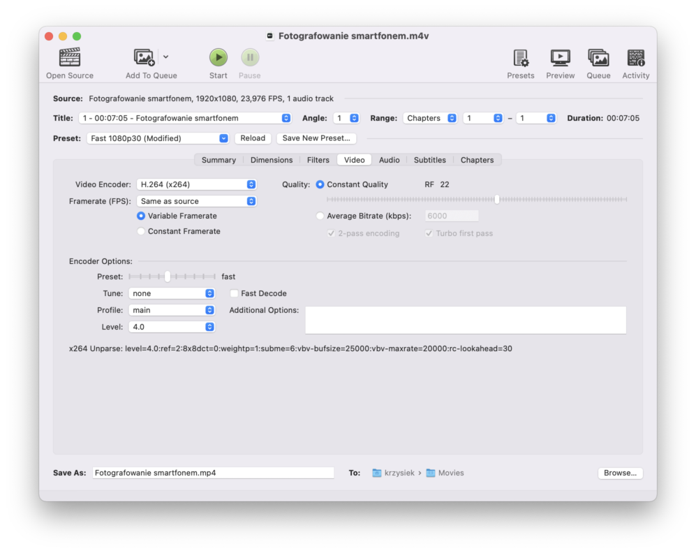 - Jakość: Pozostaw wartość na poziomie domyślnym 22 RF – to optymalny balans między jakością a rozmiarem pliku.