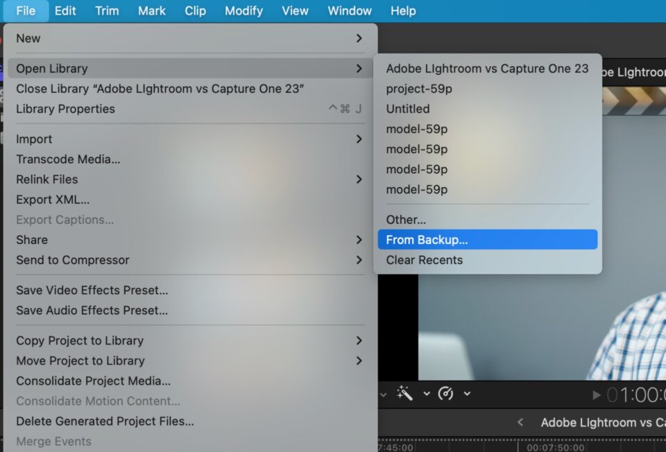 Final Cut Pro przechowuje kopie zapasowe w folderze Final Cut Pro Backups, który znajduje się w folderze Filmy. Kopie zapasowe są datowane w nazwach plików. Dodatkowo, możesz otworzyć kopię zapasową biblioteki, po prostu dwukrotnie klikając na nią.