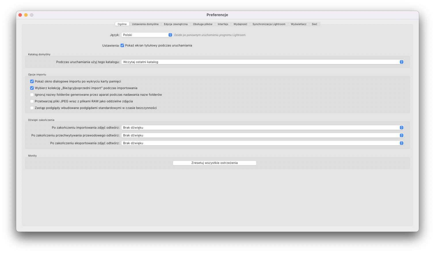 • na macu wchodzimy w menu Lightroom Classic następnie wybieramy z listy Preferencje,