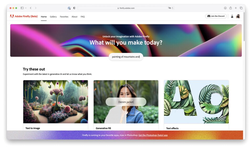 Jedną implementacji tej funkcji jest usługa udostępniona przez firmę Adobe – FireFly. Początkowo usługa istniała tylko w postaci strony internetowej na której mogliśmy opisać co powinno znaleźć się na obrazie wygenerowanym przez AI, wybrać styl oraz proporcje wygenerowanego obrazu. Niestety jednak w niektórych przypadkach pojawiały się duże problemy z niektórymi elementami generowanego obrazu, na przykład dłonie w szczególności palce w niektórych przypadkach nie są nawet w połowie zgodne z rzeczywistością.