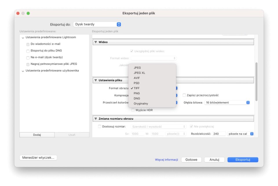 Jeśli zdecydujemy się na taką formę zabezpieczania danych, warto rozpocząć od wybrania domyślnego formatu pliku do którego eksportujemy pliki, które chcemy zabezpieczyć. Lightroom do niedawna domyślnie eksportował zdjęcia do formatów JPG, PSD, TIFF. Pierwszy z nich zdecydowanie odradzam ze względu na stratną kompresję. Z kolei pliki PSD i TIFF mogą mieć duże rozmiary czasami nawet porównywalne z plikami RAW. Co w takiej sytuacji zrobić?